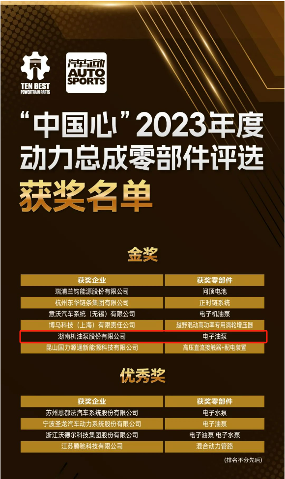 ?2023年11月8日 ,“中國(guó)心”2023年度動(dòng)力總成零部件評(píng)選公布,湖南機(jī)油泵股份有限公司研發(fā)的電子油泵作為動(dòng)力總成潤(rùn)滑系統(tǒng)的“心臟”,榮獲了業(yè)界具影響力的金獎(jiǎng)。這一殊榮不僅是對(duì)湖南機(jī)油泵不懈追求卓越品質(zhì)和技術(shù)領(lǐng)先地位的認(rèn)可,也標(biāo)志著公司在全球動(dòng)力總成領(lǐng)域的領(lǐng)跑者地位。